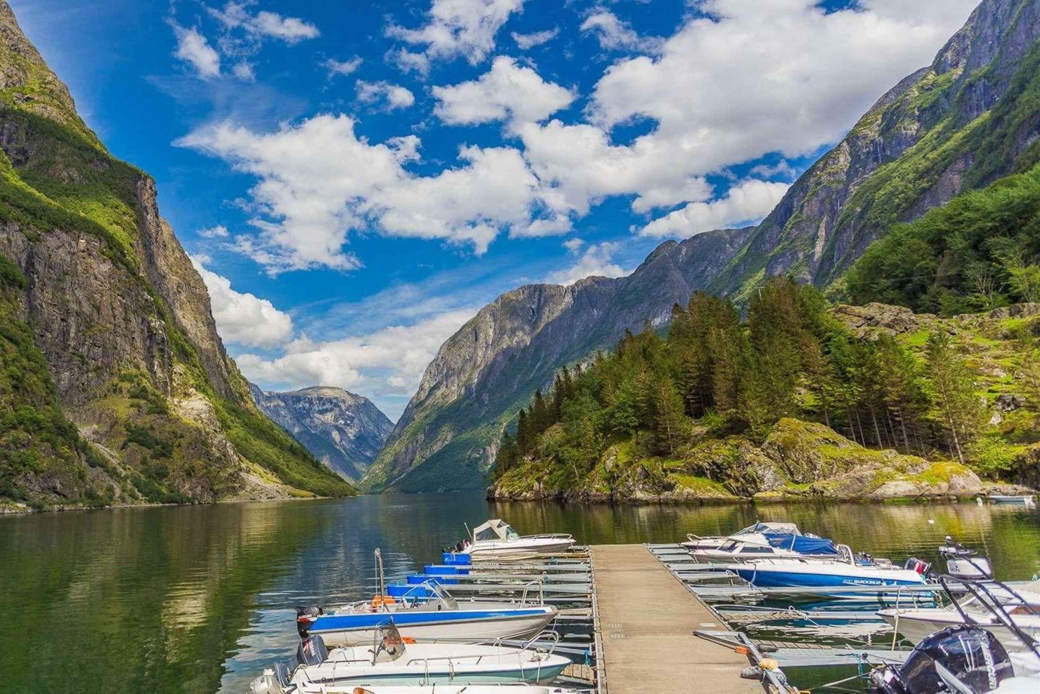 Desde allí, sigue hasta el pueblo de Gudvangen, donde subirás a un barco eléctrico moderno para un crucero de 2 horas por el Nærøyfjord. Rodeado de montañas escarpadas, cascadas y granjas remotas, este fiordo, declarado Patrimonio de la Humanidad por la UNESCO, es considerado uno de los más bonitos del mundo.