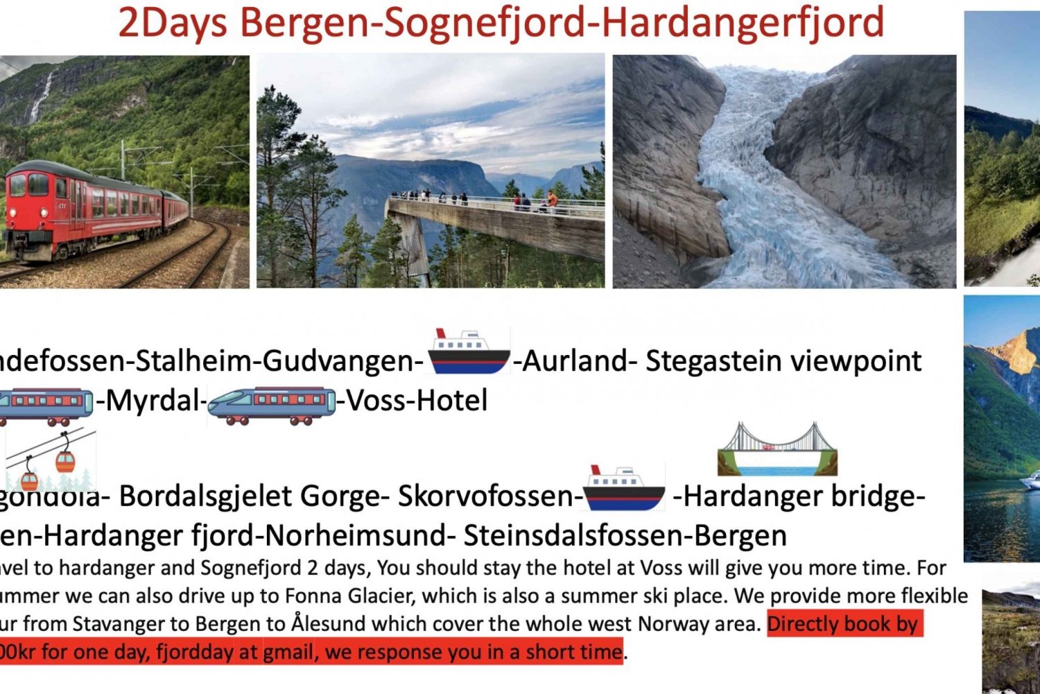 2 yötä vuonohotellissa. Nærøyfjordin risteily, Flåmin juna, Voss Gondal, Hardangerfjordin risteily. kaikki lautat ylittävät vuonon. Autokuljetus. opaspalvelu.