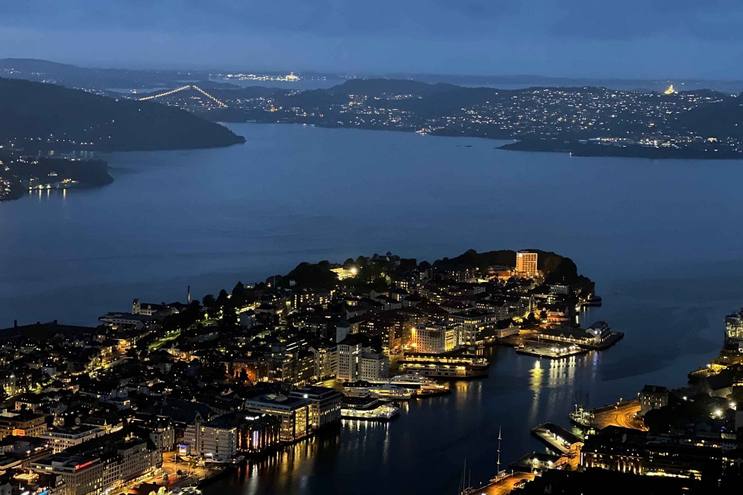 Nadat we van het uitzicht hebben genoten, dalen we af naar de fjord en verkennen we onderweg een van de charmante oude wijken van Bergen. Hier ontdek je de magie van Bergen, ongeacht het uur, van het rustige ochtendlicht tot de sprankelende stad 's nachts.